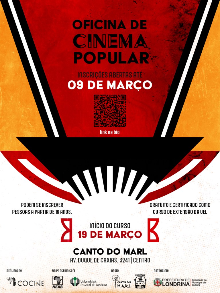 A Oficina de Cinema Popular chega a sua terceira edição neste ano e é uma realização do Cocine – Coletivo de Cinema Negro de Londrina. O proejto tem patrocínio da Prefeitura de Londrina, por meio da Secretaria Municipal de Cultural, através do Programa Municipal de Incentivo à Cultura – Promic de Londrina.